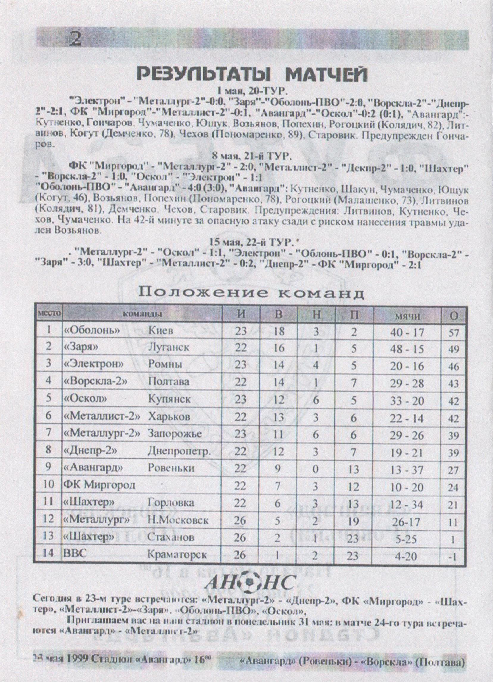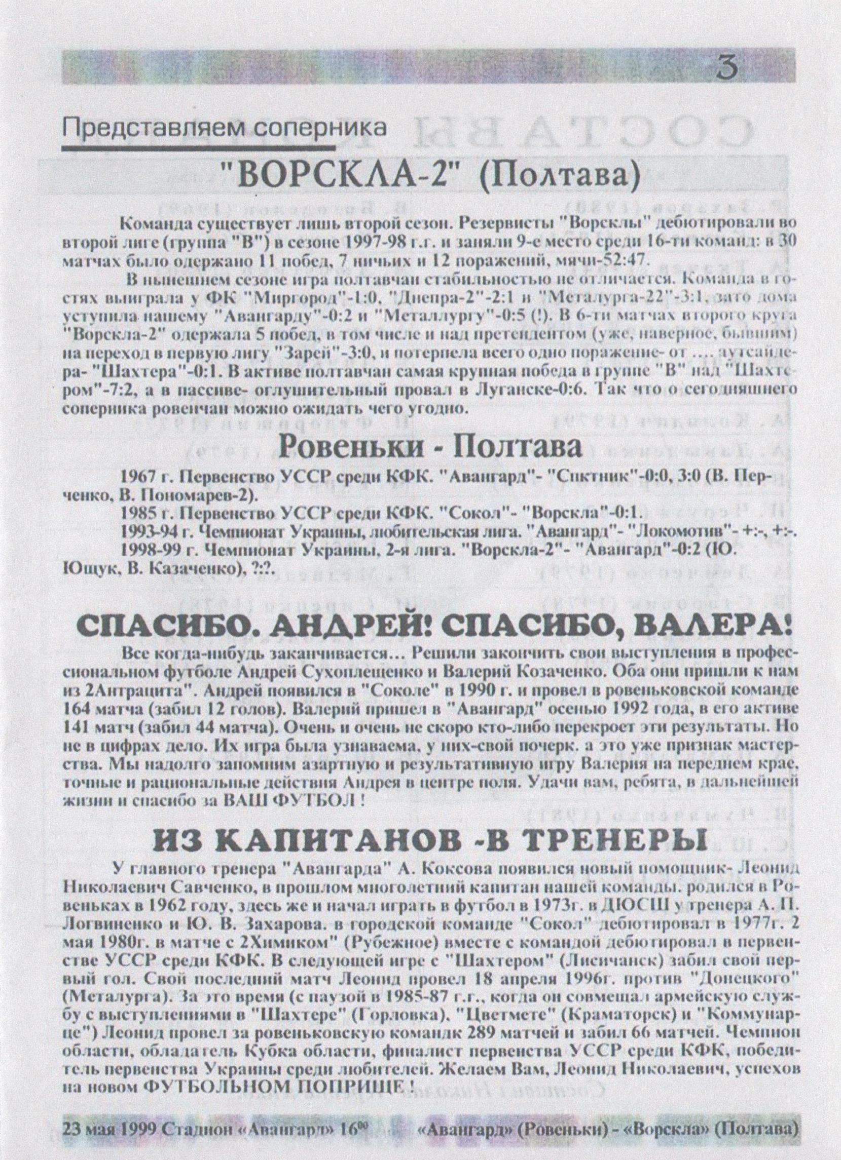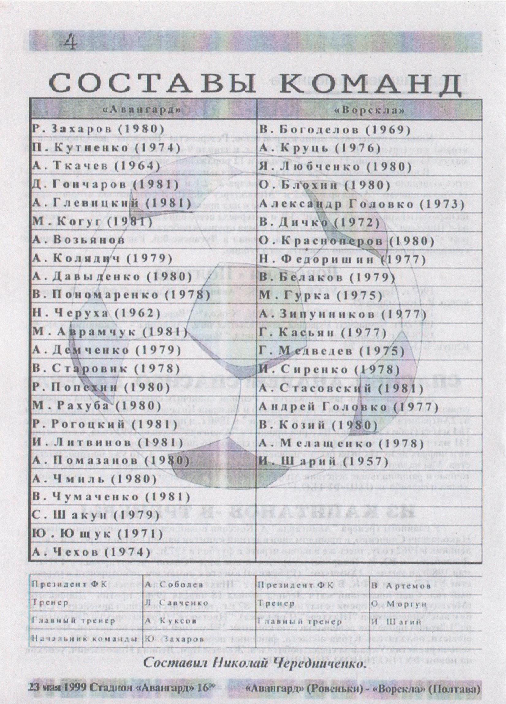 23 травня 1999 року. “Авангард” Ровеньки – “Ворскла-2” – 1:1