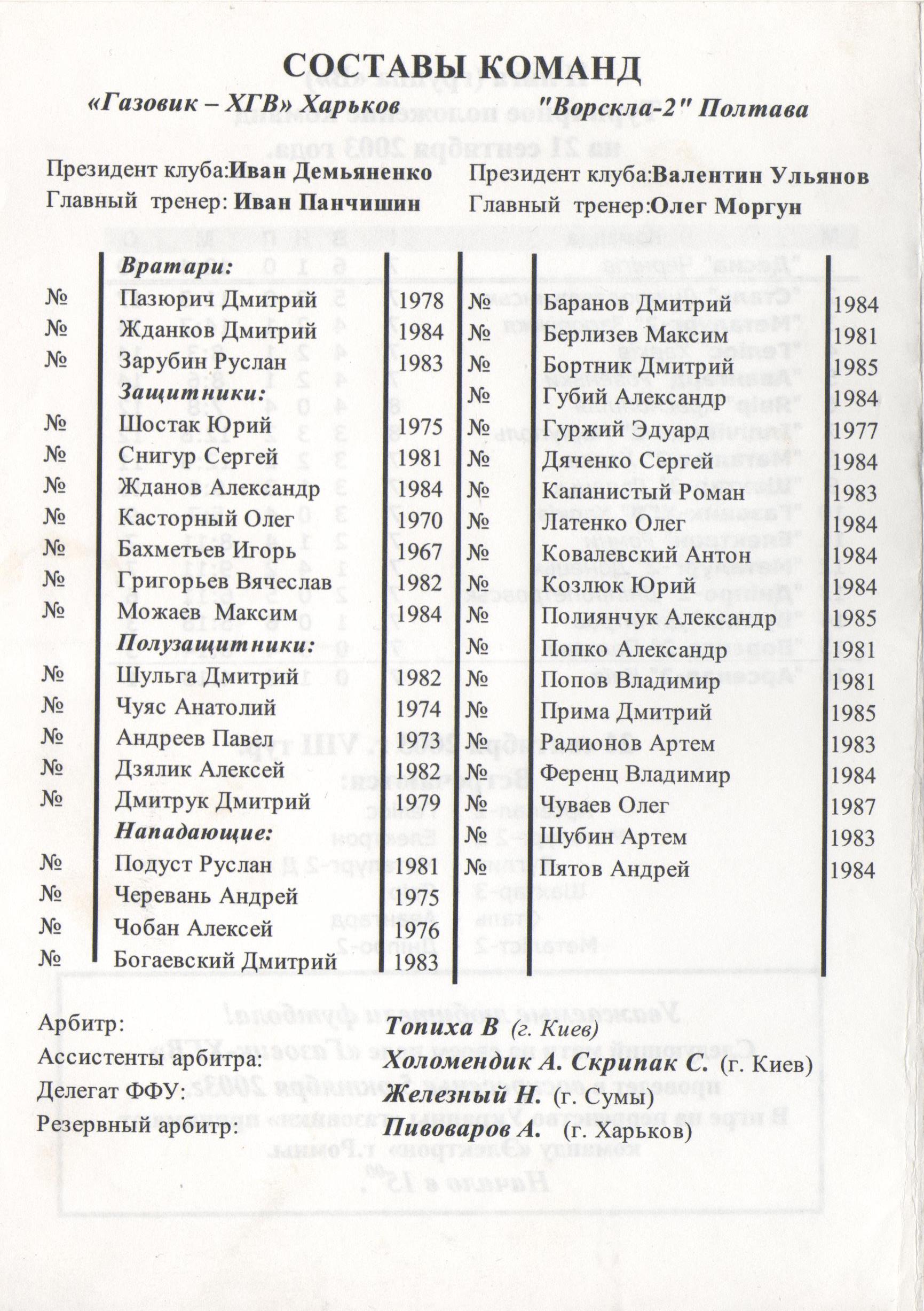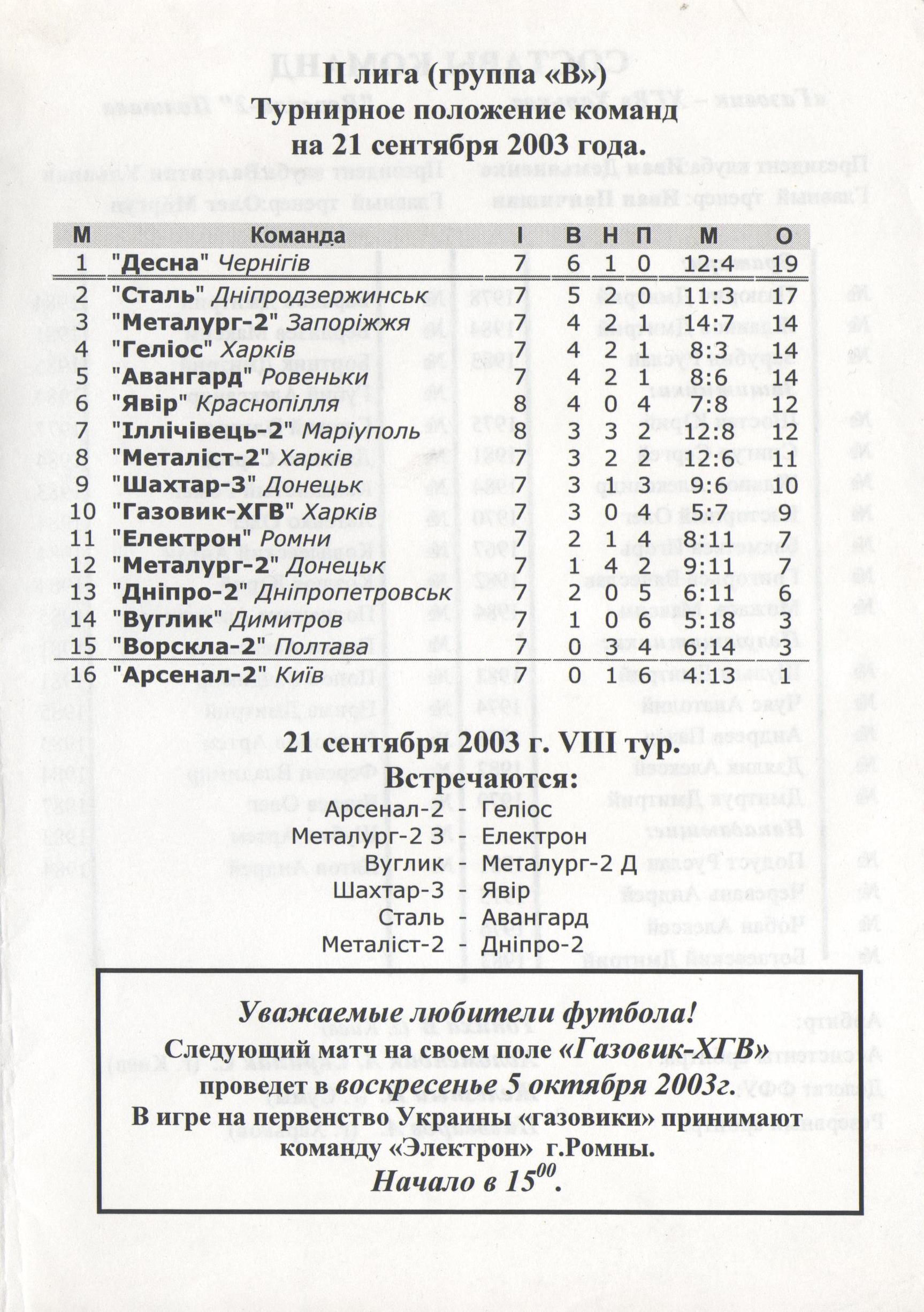 21 вересня 2003 року. “Газовик-ХГВ” Харків – “Ворскла-2” – 2:0