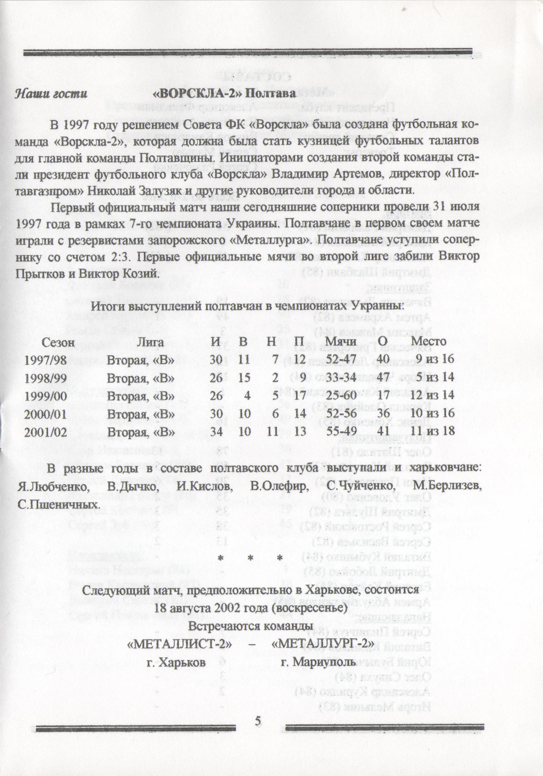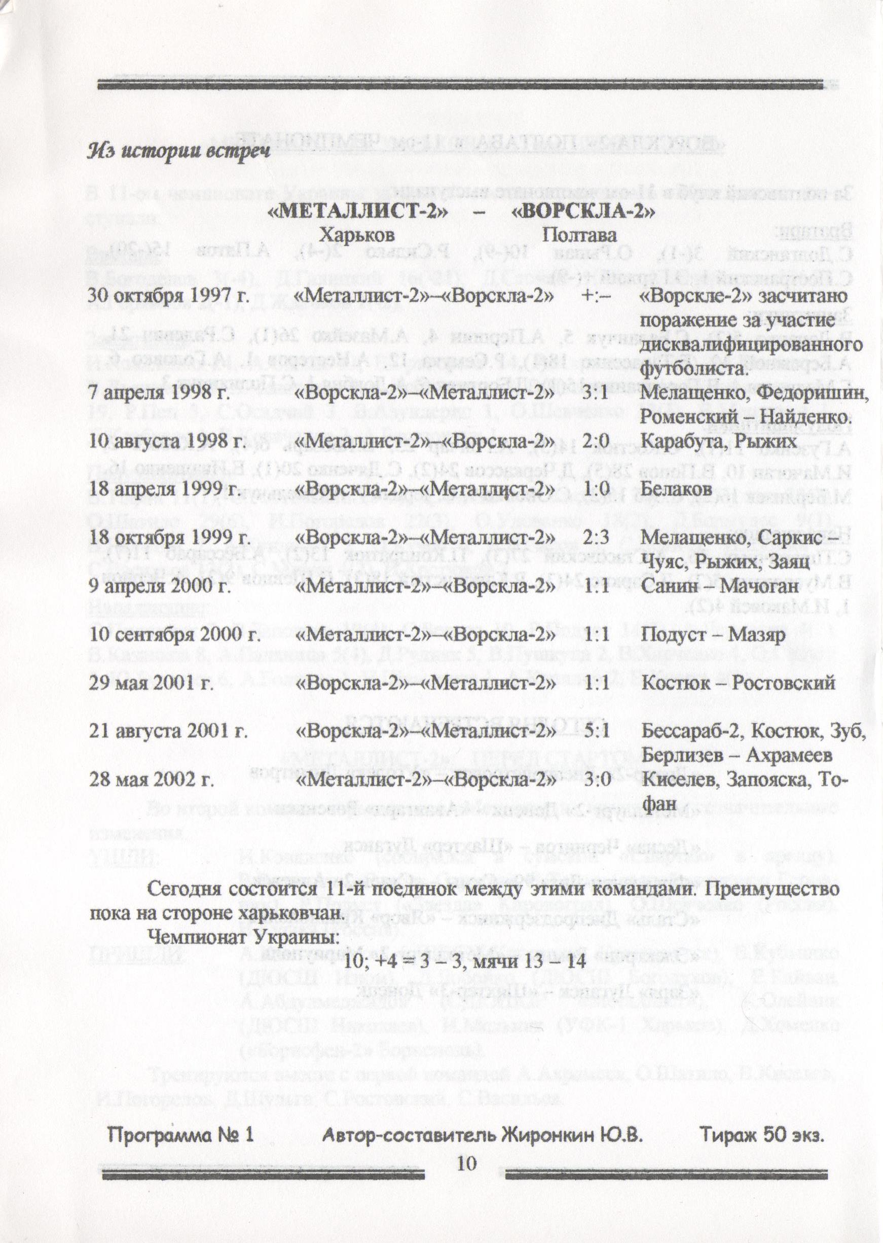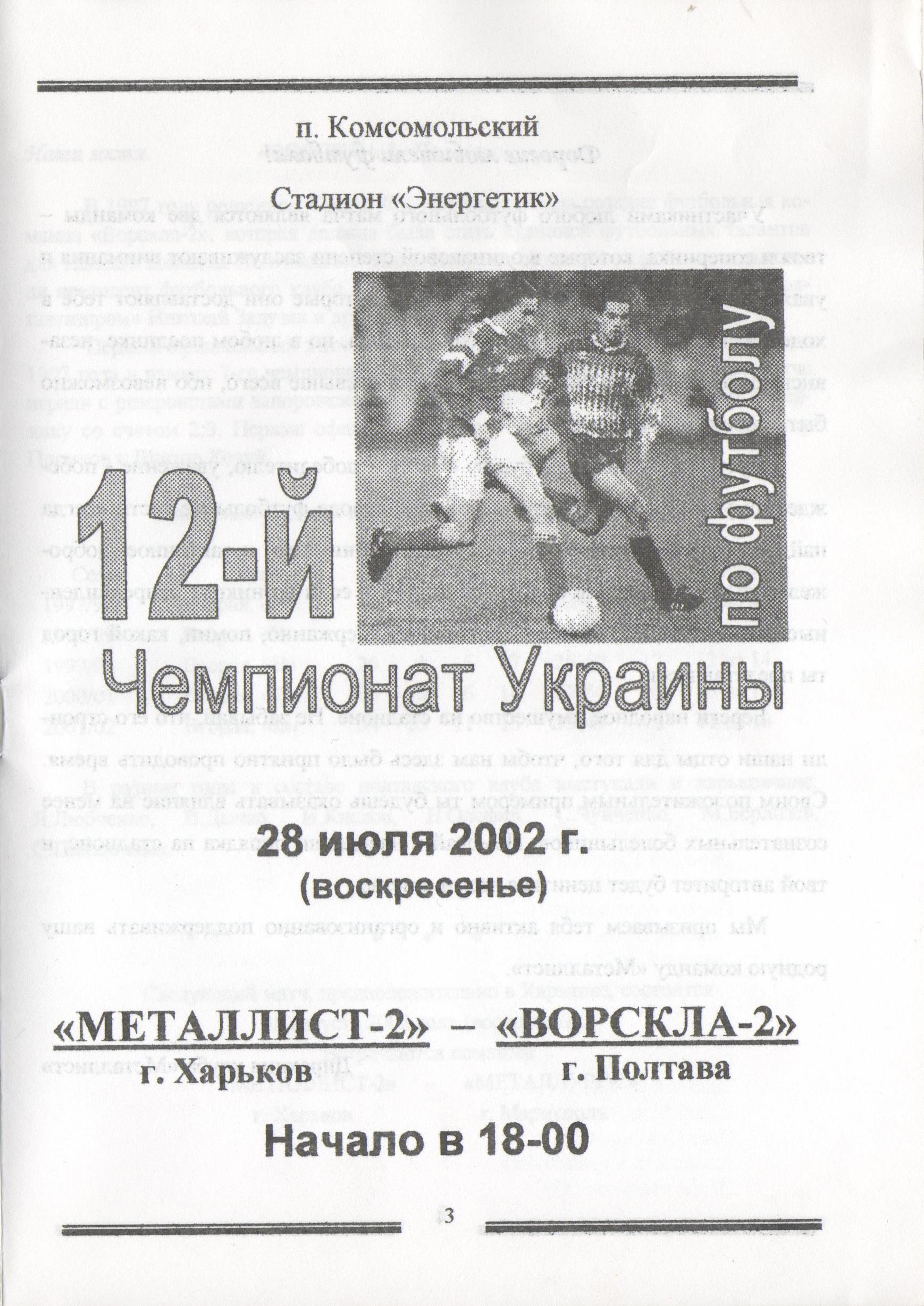 28 липня 2002 року. “Металіст-2” Харків – “Ворскла-2” – 1:1 (Кісельов – Бессараб)