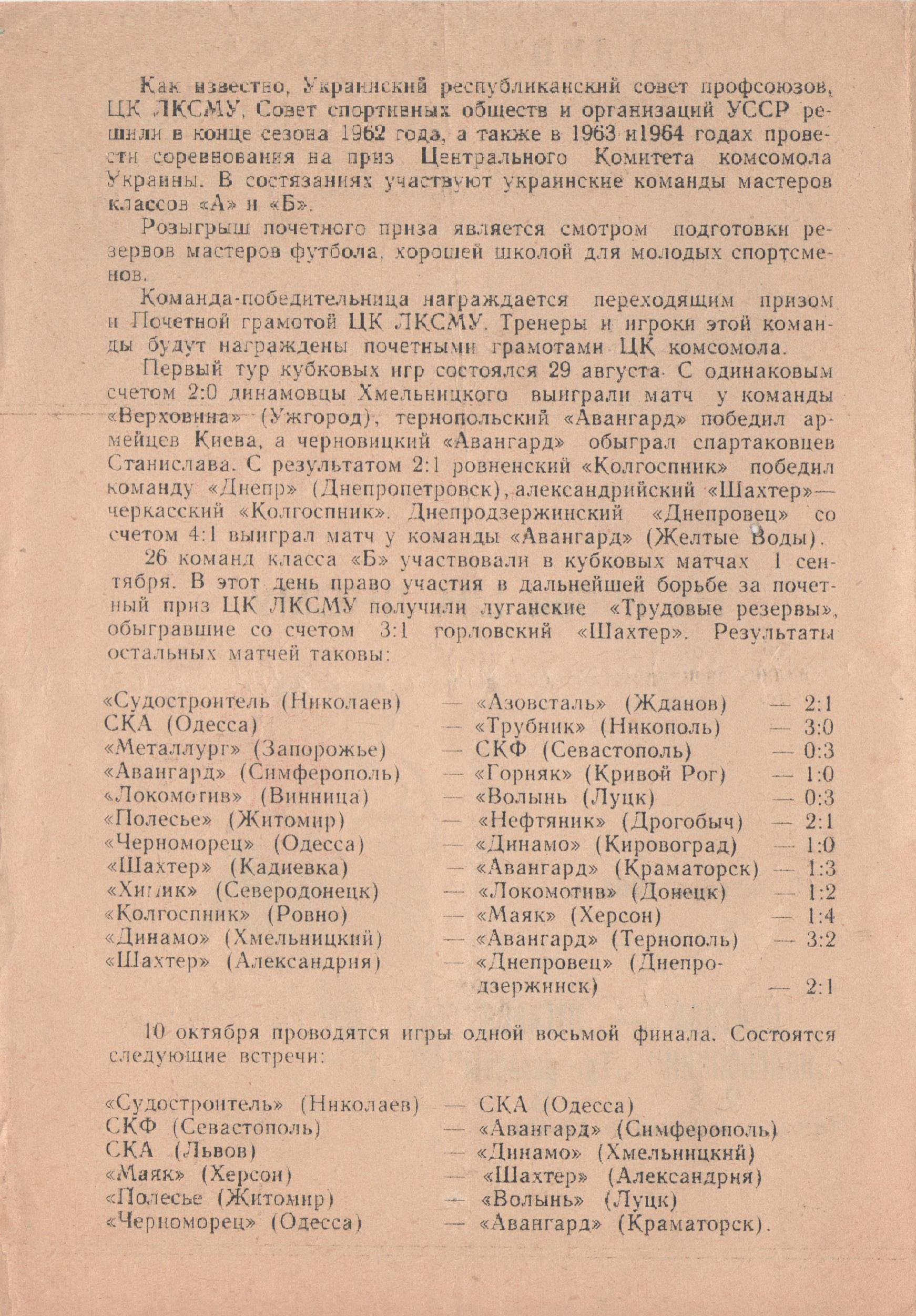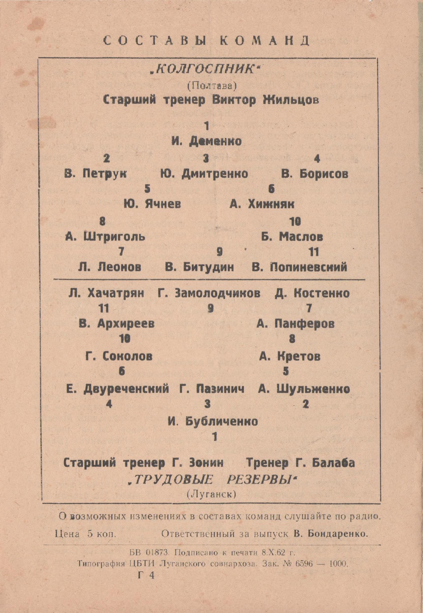 “Трудові Резерви” Луганськ – “Колгоспник” (Кубок ЦК ЛКСМУ. 1962. 1/8 фіналу)